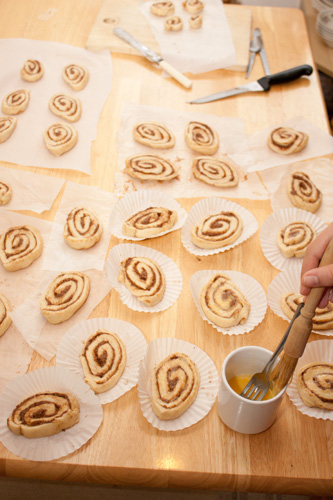 Beat the egg and then use a brush to glaze each whirl with the egg. Put the cinnamon whirls onto trays, for a standard size tray 6 whirls per tray works well. Cover the tray with cling film / plastic wrap and put in a warm place to rise for 20 minutes.